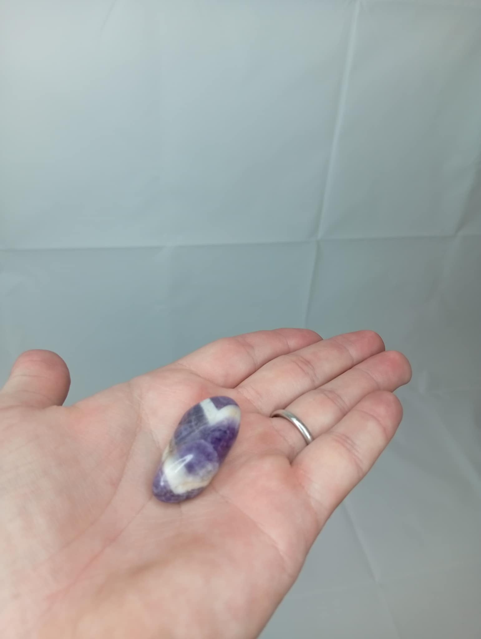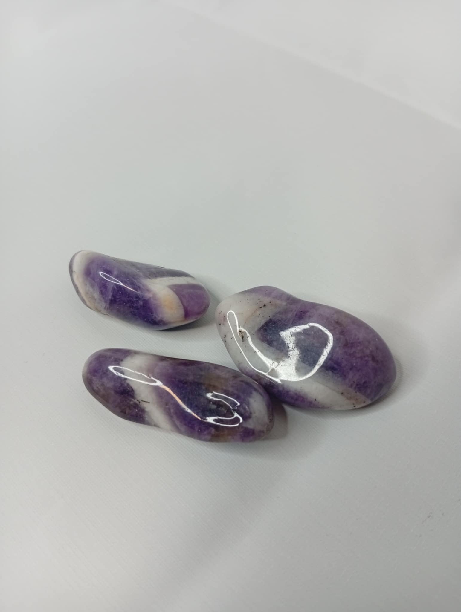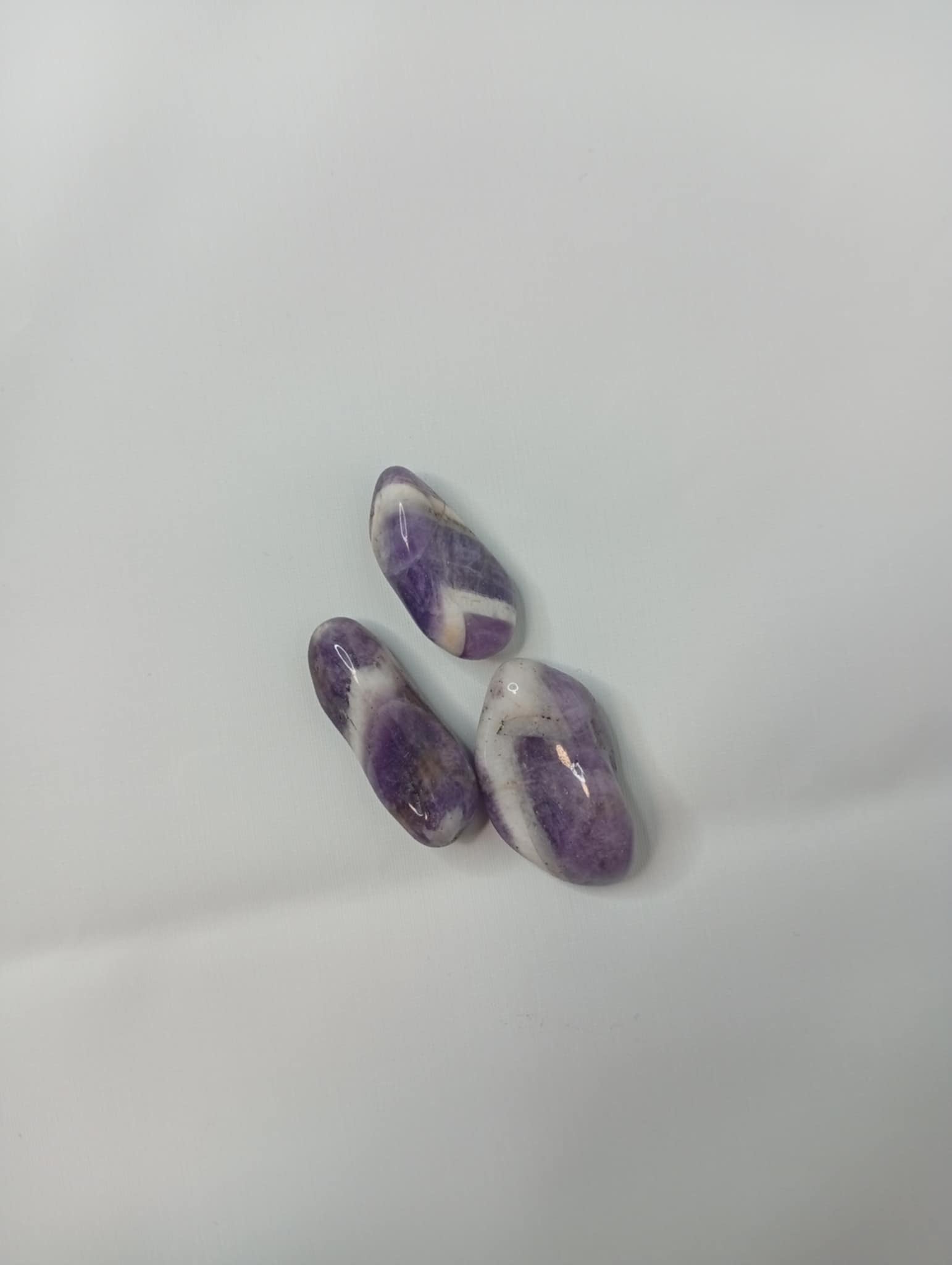 Chevron Ametyst kombinerer lilla ametyst og hvid kvarts i et V-formet mønster, og siges at være stærkere end almindelig ametyst. Den bruges til at styrke intuition, åbne det tredje øje og skabe mental klarhed under meditation og stress.