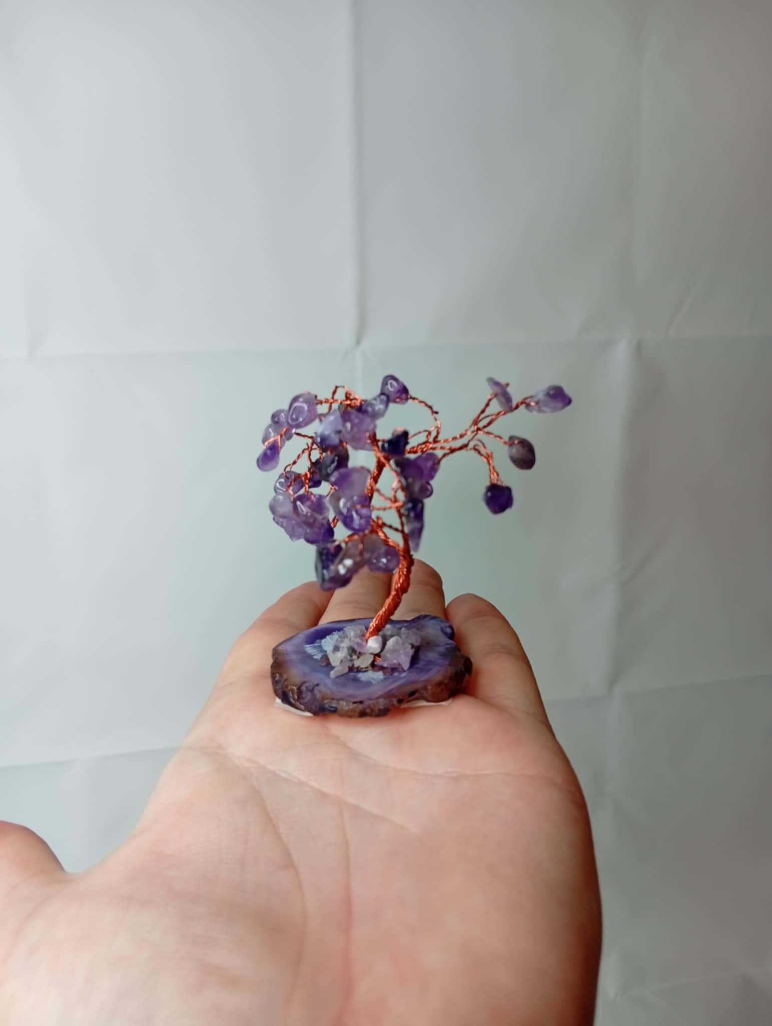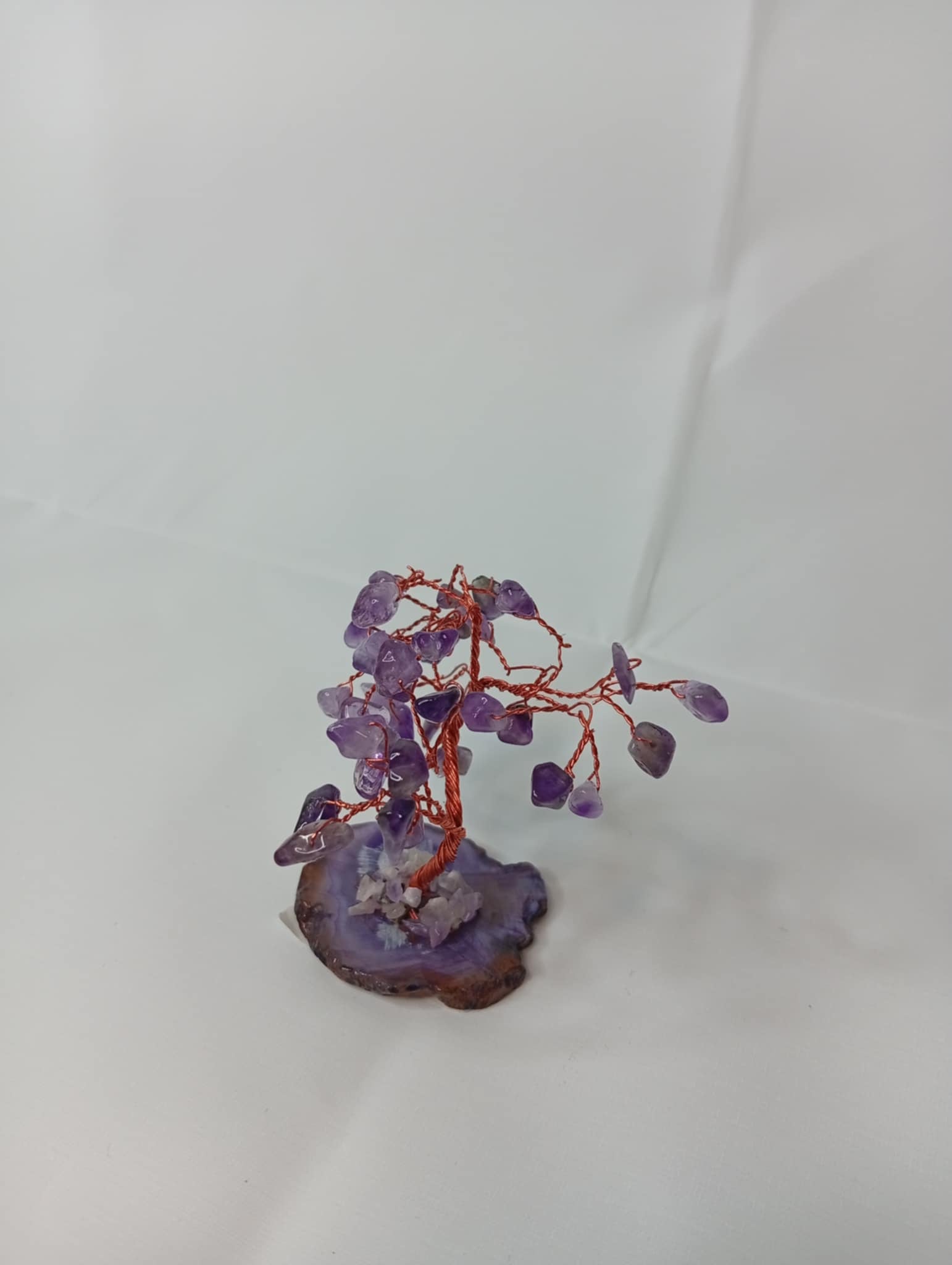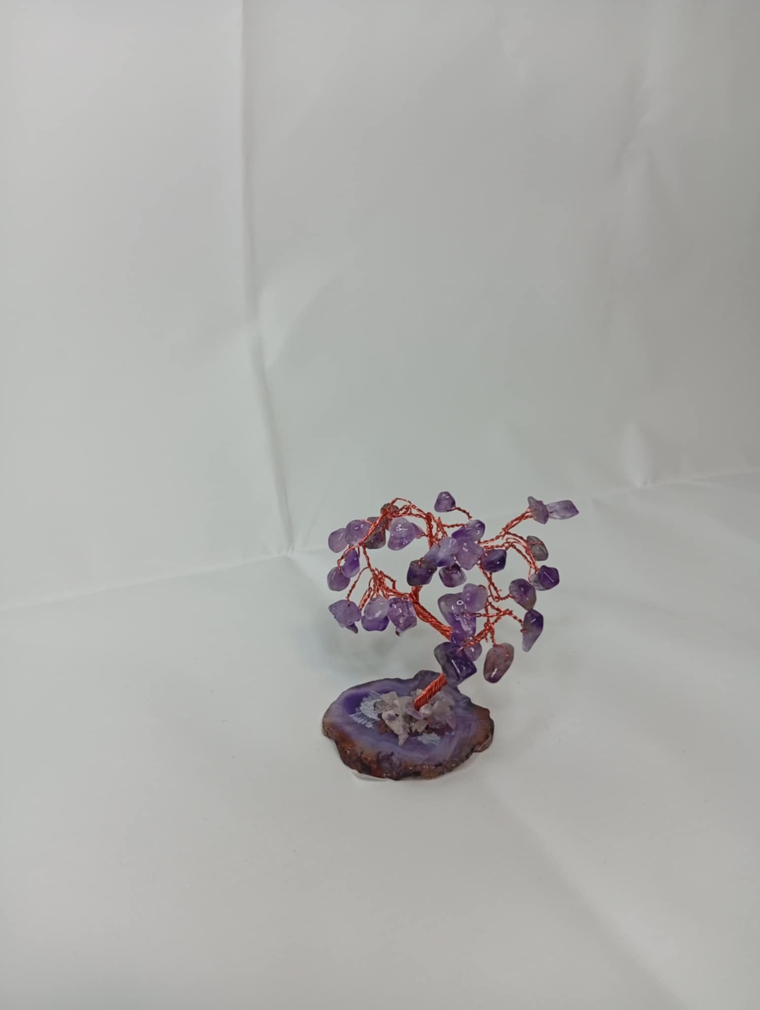 Et dekorativt energitræ med lilla ametyst-blade, som siges at styrke intuition, ro og spirituel forbindelse. Træet står på en naturlig stenbase (ofte agat eller kvarts), der giver grounding og stabilitet. Et smukt og meningsfuldt element til dit hjem, kontor eller alter.